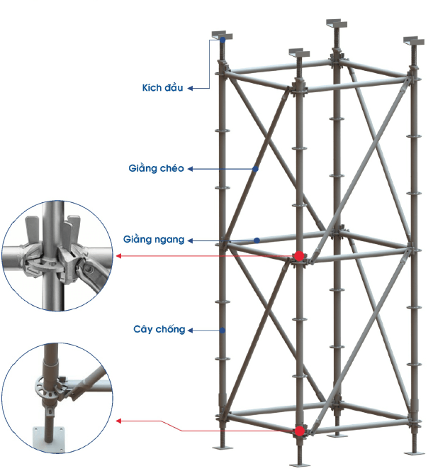 • Liên kết đĩa chốt: Các thanh giằng ngang và giằng chéo được kết nối với cây chống đứng thông qua các túi chốt. Khi đóng chốt, hệ thống tạo thành một kết cấu cứng, chống rung lắc tuyệt đối, vượt trội hơn hẳn so với giàn giáo truyền thống.